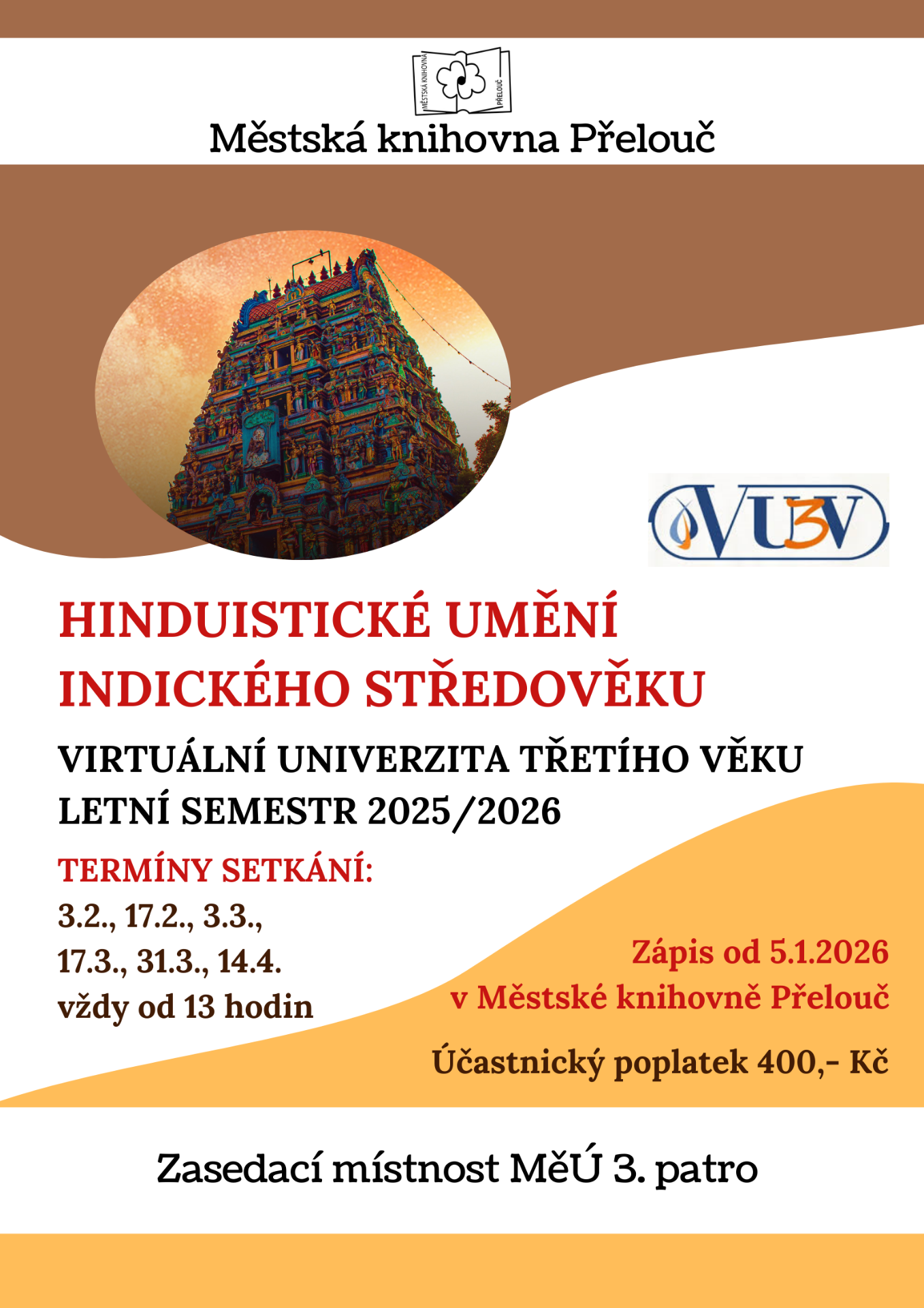 Srdečně zveme zájemce o studium Virtuální univerzity třetího věku. Tématem letního semestru bude Hinduistické umění indického středověku. Zápsat se můžete od 5. 1. 2026 v Městské knihovně Přelouč.