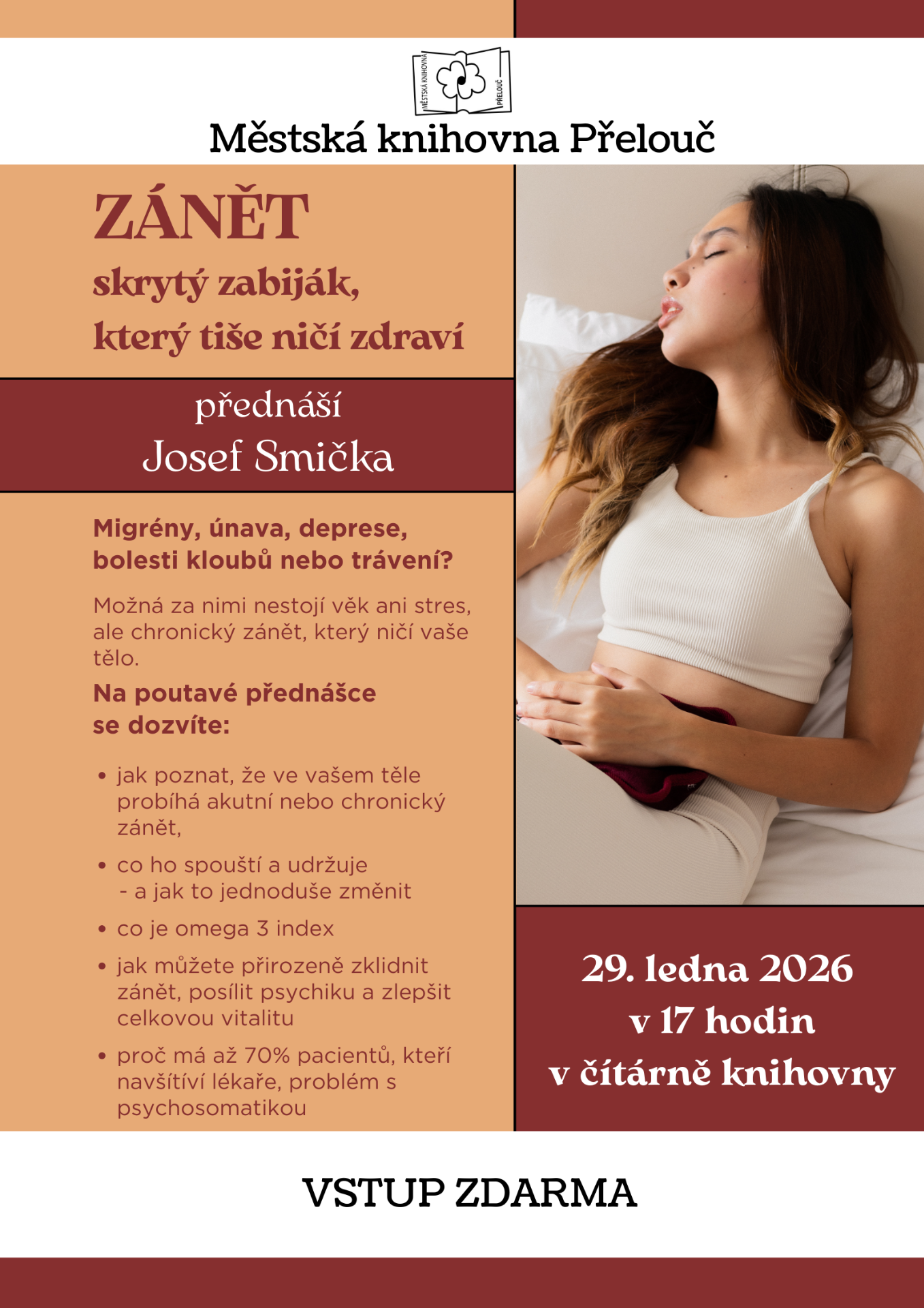 Srdečně zveme na zajímavou přednášku s názvem Zánět skrytý zabiják, která se bude konat 29. ledna 2026 v 17 hodin v čítárně Městské knihovny Přelouč.