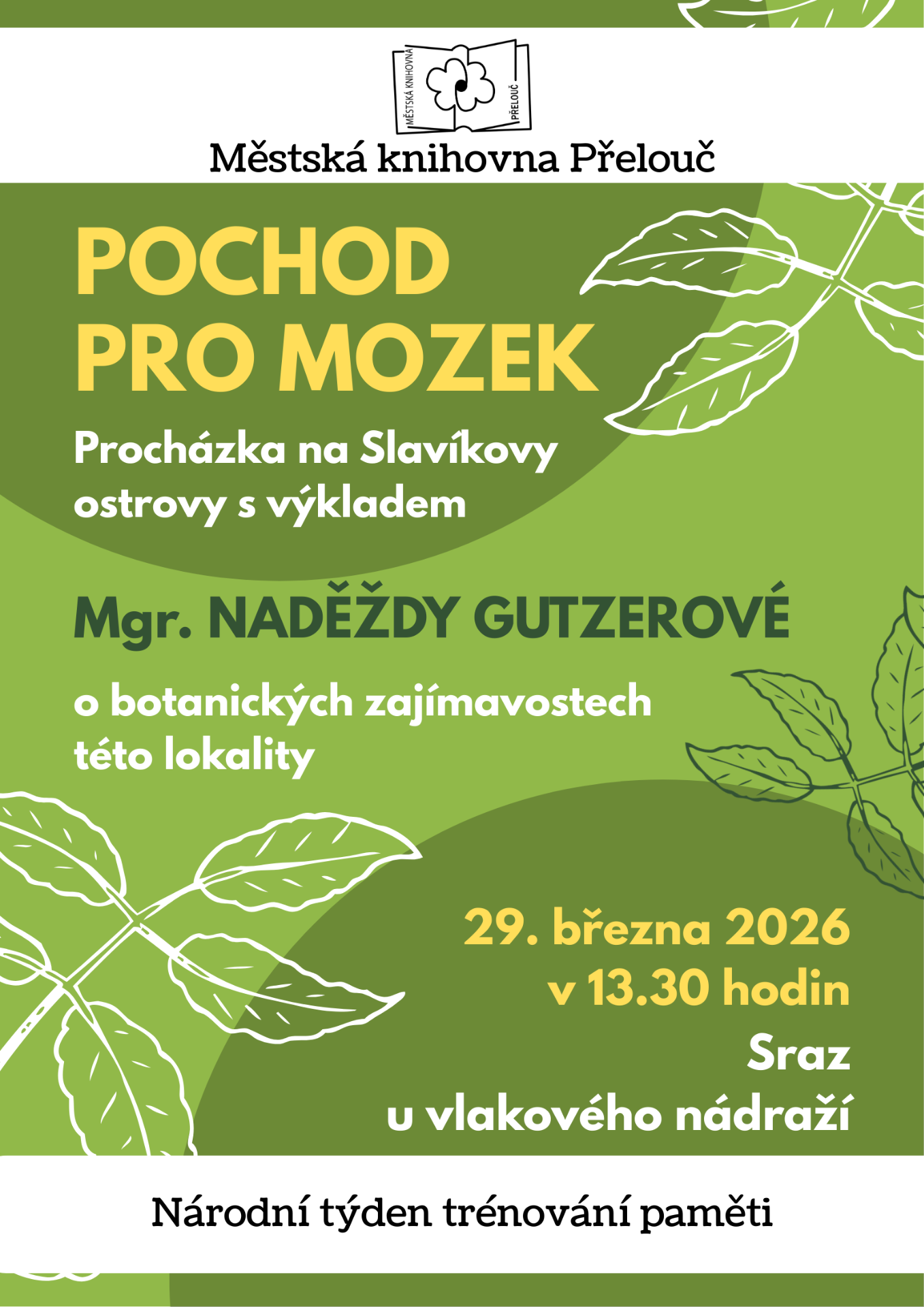 Pojďte s námi na procházku po Slavíkových ostrovech s výkladem Mgr. Naděždy Gutzerové o botanických zajímavostech této lokality. Sraz je 29. března 2026 v 13.30 hodin u vlakového nádraží. Těšíme se na vás!