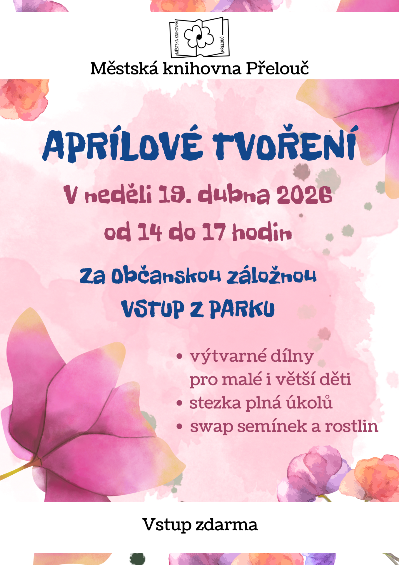 Srdečně zveme na rodinnou akci Aprílové tvoření dne 19. dubna 2026 od 14 do 17 hodin za Občanskou záložnou (vstup z parku). Pro malé i větší děti budou připraveny výtvarné dílny, stezka plná úkolů a swap semínek a rostlin.