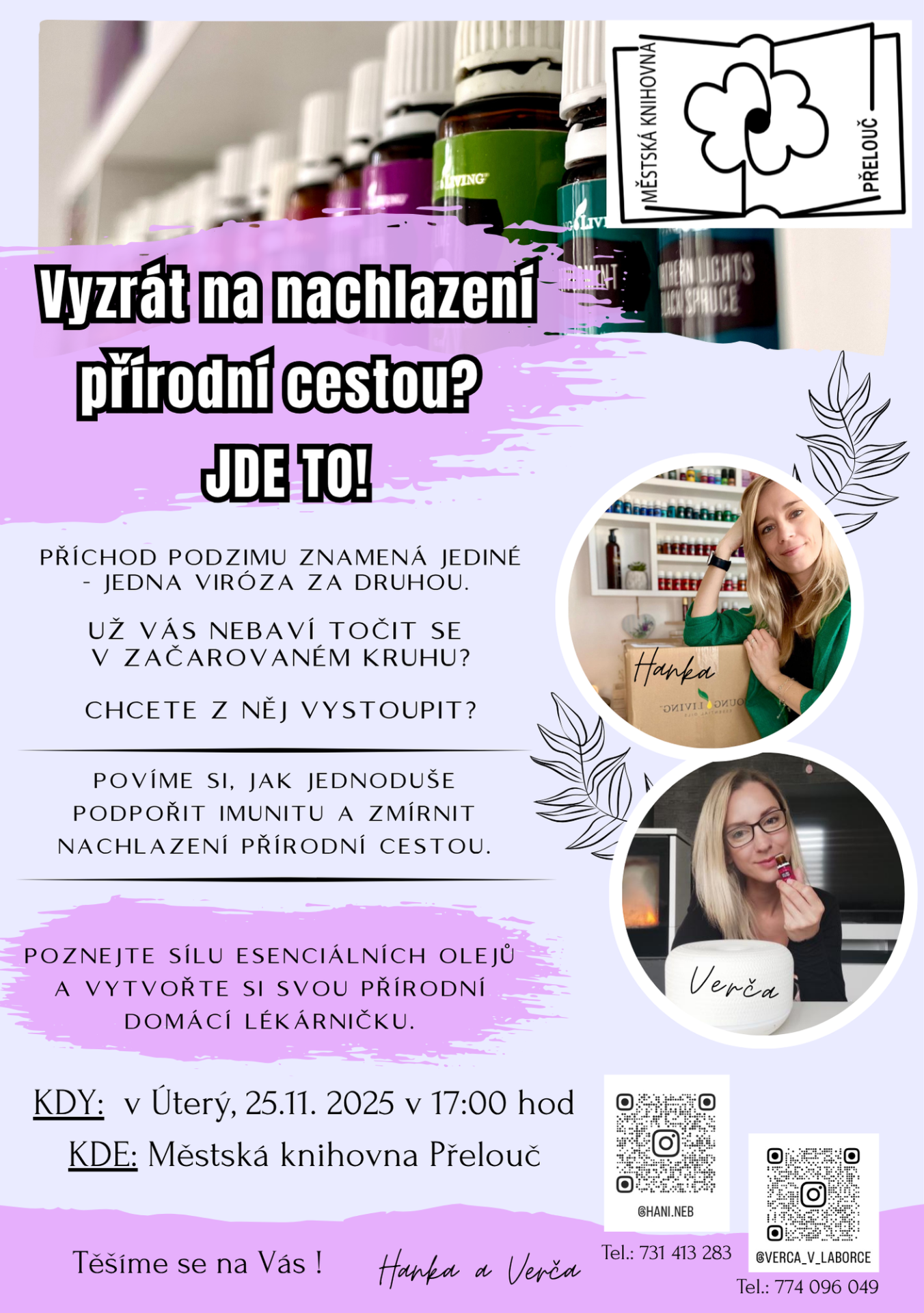 Srdečně zveme na přednášku o aromaterapii, která se uskuteční dne 25. listopadu 2025 od 17 hodin v Městské knihovně Přelouč.