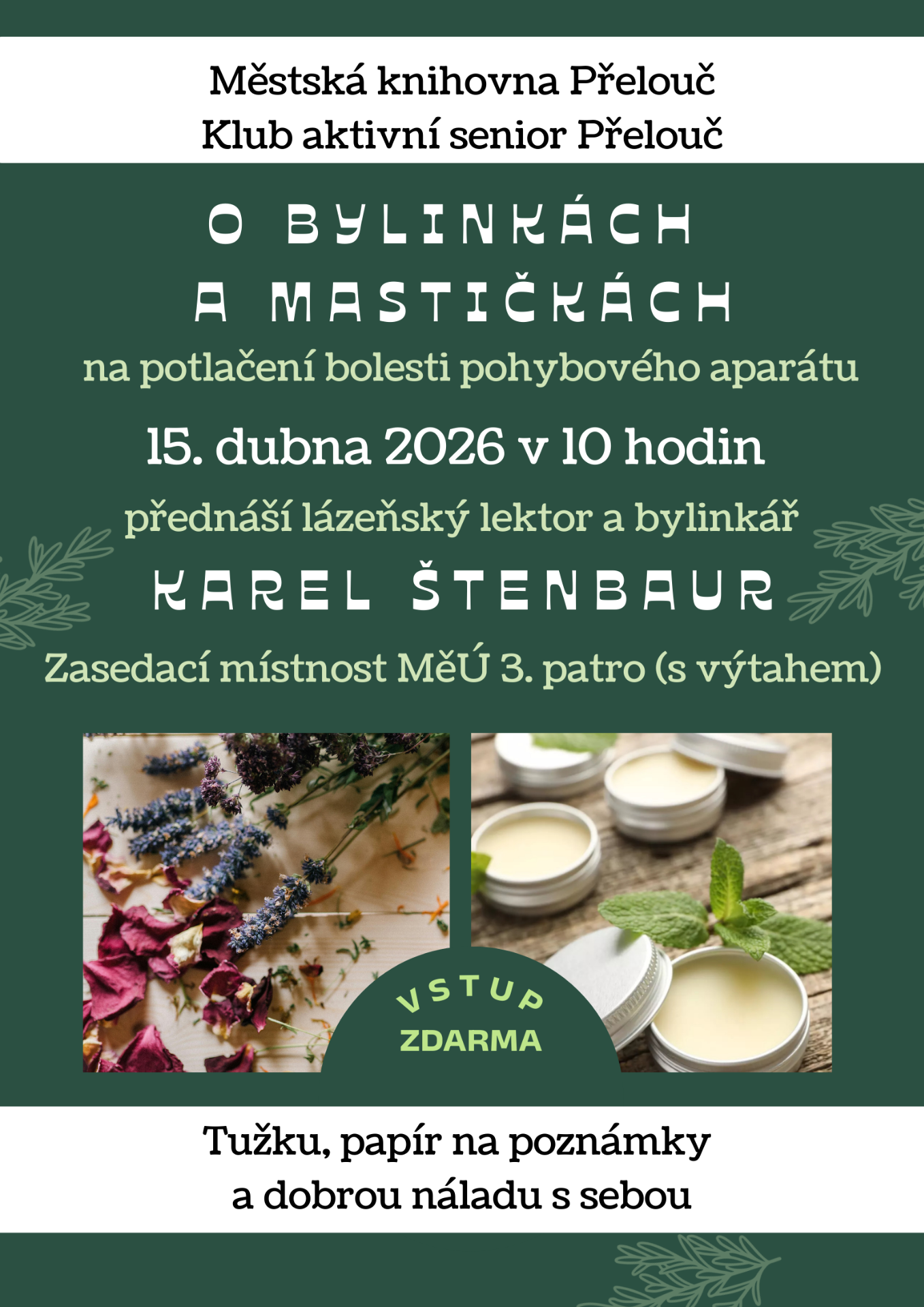 Srdečně zveme na přednášku O bylinkách a mastičkách na potlačení bolesti pohybového aparátu dne 15. dubna 2026 od 10 hodin v zasedací místnosti Městského úřadu Přelouč - 3. patro s výtahem. Přednášet bude lázeňský lektor a bylinkář Karel Štenbaur.