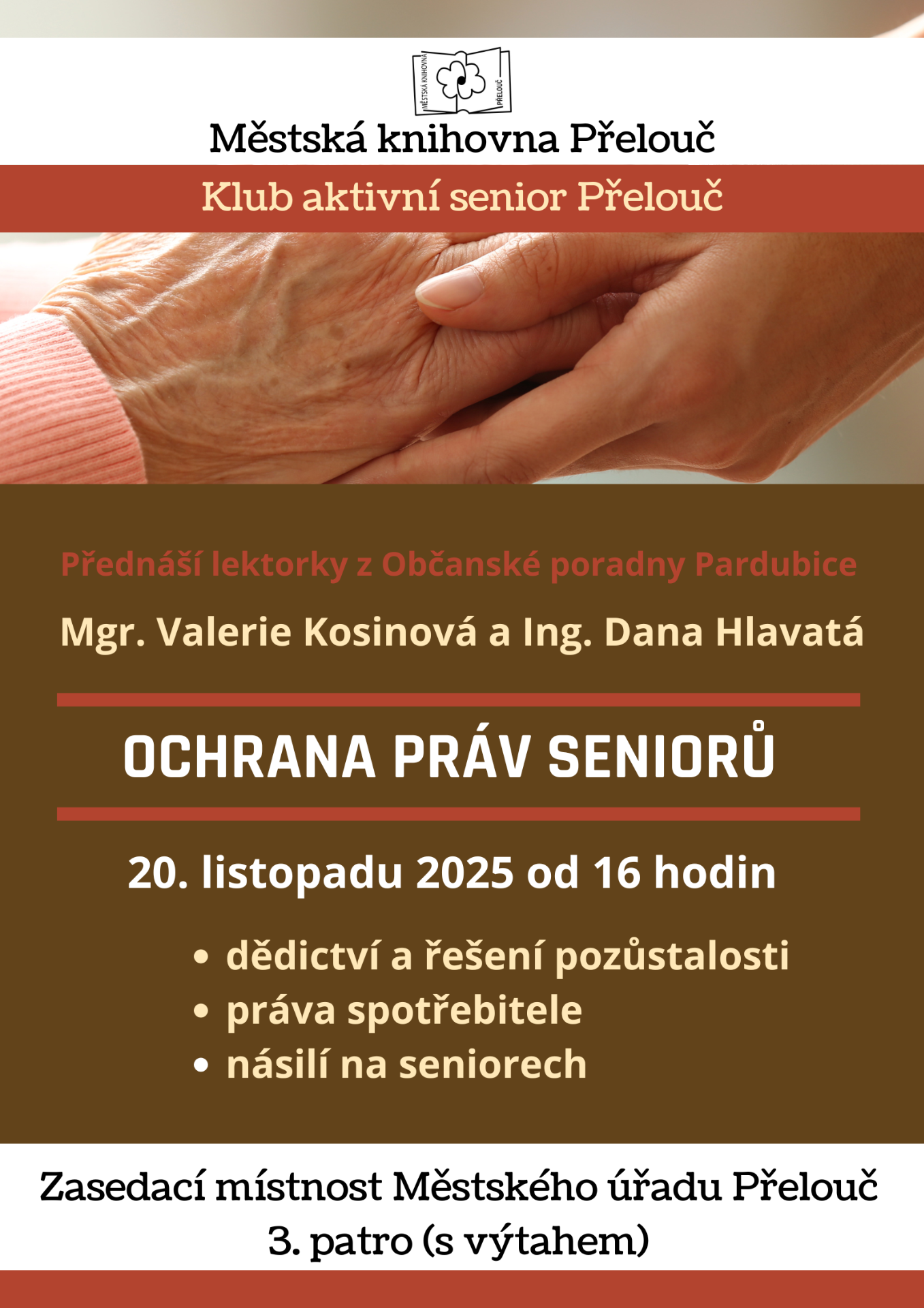Srdečně zveme na přednášku letorek z Občanské poradny Pardubice dne 20 listopadu 2025 od 16 hodin v zasedací místnostni Městského úřadu Přelouč.